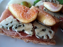 バゲットに生ハムとブルーチーズと、ブランデーに一日漬けたいちじくをのせて、