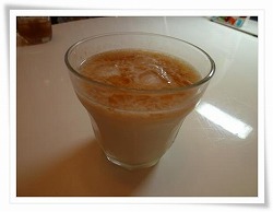 バナナをつけたブランデーを30ml注ぎ、牛乳を注ぎ、よく混ぜる。お好みで氷を入れていただく。