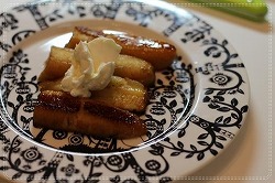 (1)フルブラで漬けたバナナを縦半分に切り、バターを熱したフライパンで焼く。メープルシロップを入れて煮詰めるように焼く。