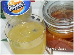 グラスに氷、自家製グレープフルーツブランデー、オランジーナを入れてできあがり。