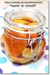 3.漬け込み瓶にオレンジの果肉、皮、梨を入れてサントリーブランデーV.Oを注ぐ。