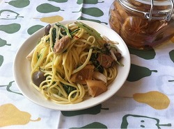 (4)油がなじんだら、ツナを入れて少し炒めてから、しめじを入れてさらに炒める。しめじに完全に火が通る前に水菜を入れ、さっと炒めて、塩、ブラックペッパーを入れて混ぜる。