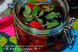 冷凍の苺とブルーベリー、ミントを瓶に入れてブランデーを注ぐだけ!!
