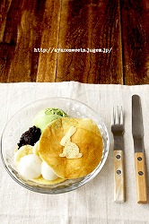 3.クレープ生地を丸型2枚とうさぎ型1枚抜きとり、あんこ・アイス・白玉・バナナを挟む。