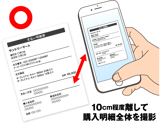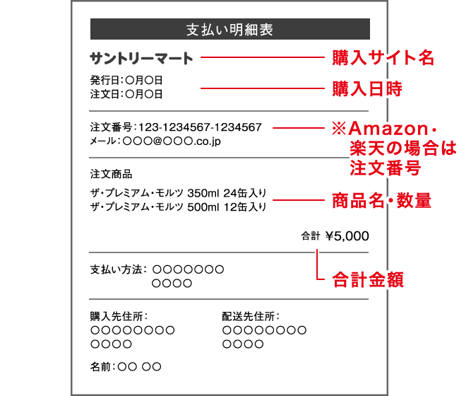 購入日時、購入サイト名、商品名・数量、合計金額が写るようにする。