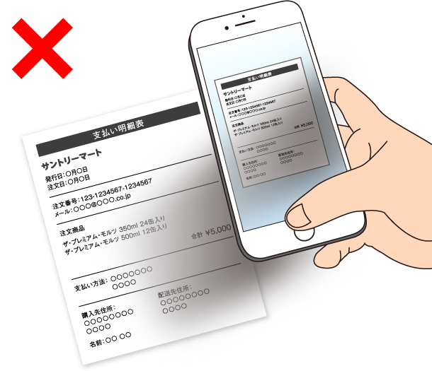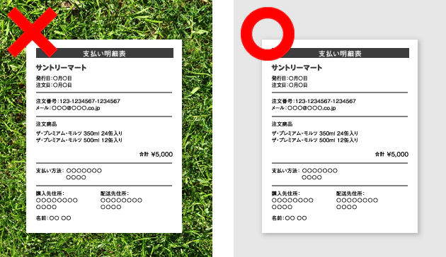 氏名、メールアドレス、住所、電話番号、クレジットカード情報など、個人を特定できる情報は、画像編集などで削除または隠して撮影してください。