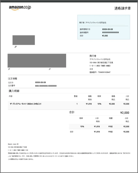 判定に必要な項目が全て出力されるため、Amazonの場合は請求書(適格請求書)を推奨しております。