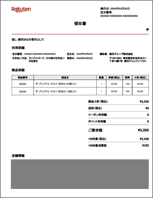 判定に必要な項目が全て出力されるため、楽天の場合は領収書・請求書を推奨しております。